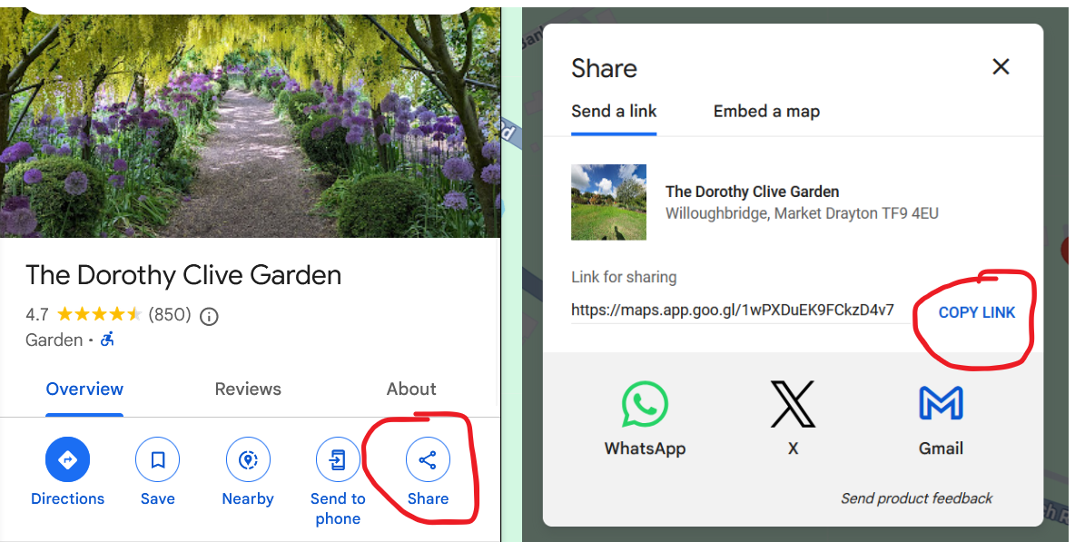 To get your Google Maps link, open google maps and go to your business entry. Click 'Share', then you will get the 'Link for sharing' as per the photo below shown with red circles. Please copy that link into the box above